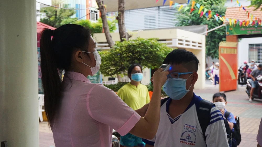 Học sinh trường Tiểu học Võ Văn Tần, quận 6 được đo thân nhiệt trước khi vào lớp. Ảnh: NQ