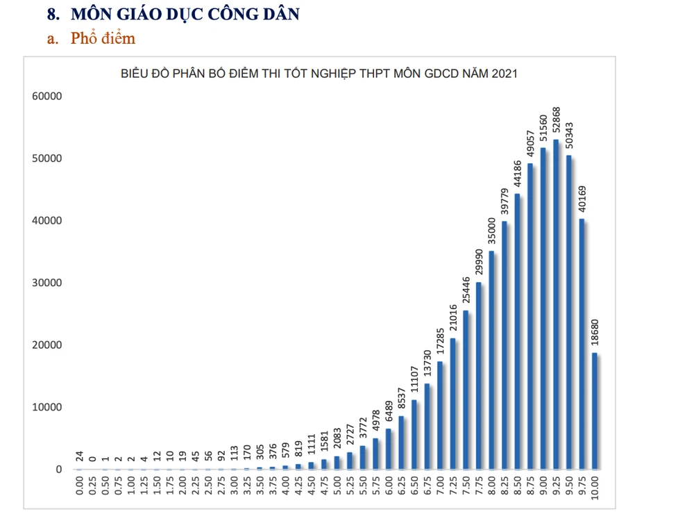 Trong 8 môn thi, môn GDCD có hơn 18.000 điểm 10, môn Văn vẫn là môn thi ít điểm 10 nhất với 3 con 10 của 3 thí sinh ở Huế, Đà Nẵng và Tiền Giang.