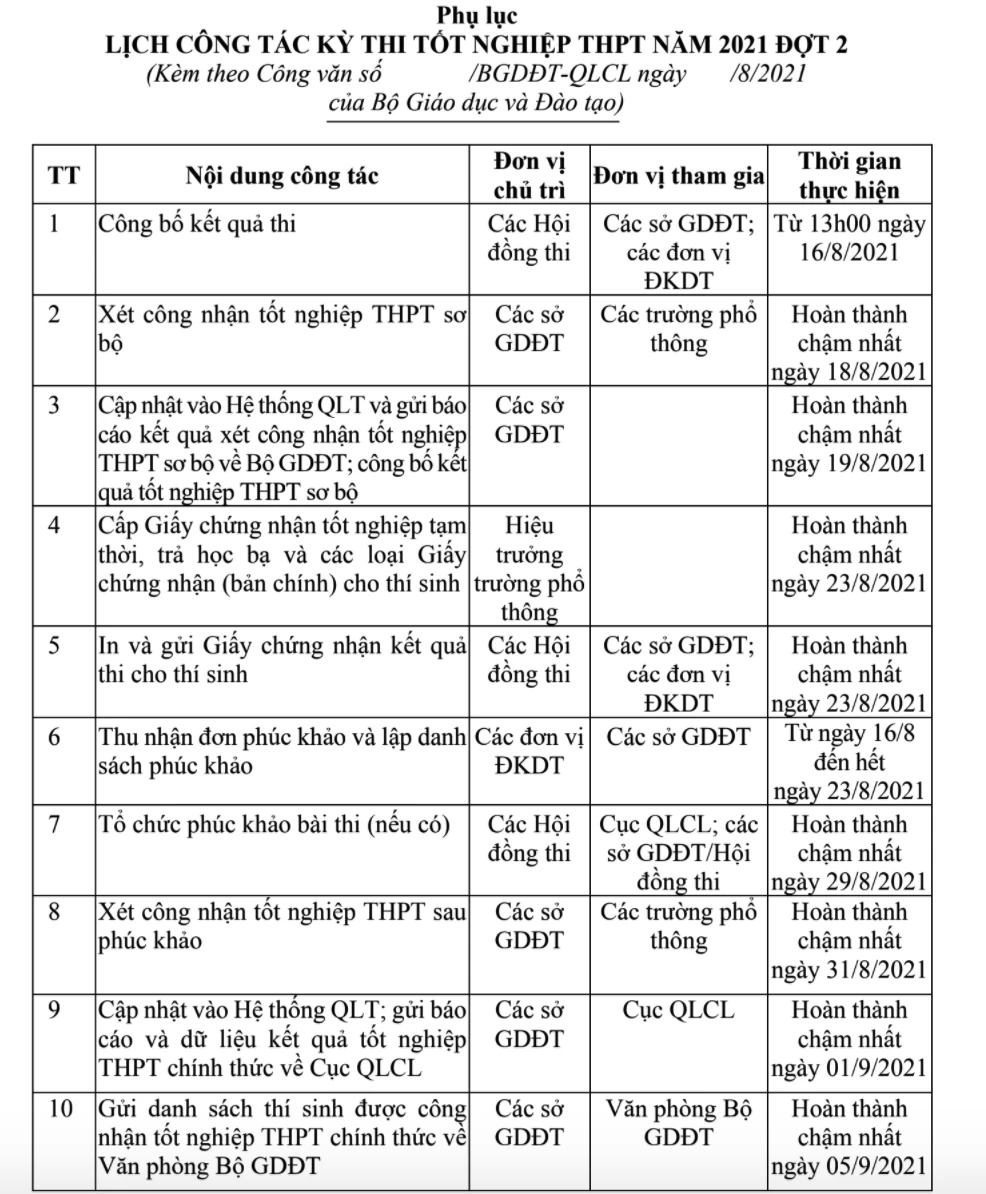 Bộ GD&ĐT cũng điều chỉnh thời gian cấp Giấy chứng nhận tốt nghiệp tạm thời, trả học bạ và các loại Giấy chứng nhận (bản chính) cho thí sinh. Việc này phải hoàn thành chậm nhất ngày 23-8, thay vì ngày 30-8.