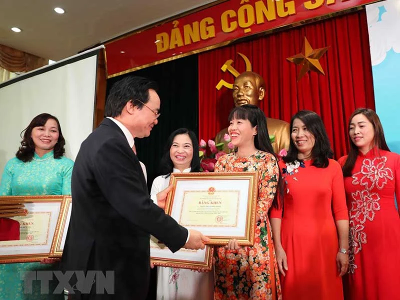 Bộ trưởng Phùng Xuân Nhạ trao bằng khen cho các giáo viên có thành tích xuất sắc trong công tác giáo dục mầm non. Ảnh: THANH TÙNG/TTXVN