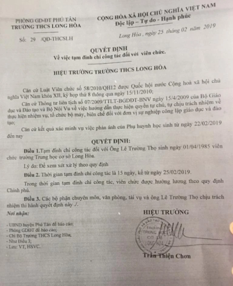 Quyết định tạm đình chỉ công tác 15 ngày đối với thầy Lê Trường Thọ của trường THCS Long Hòa.