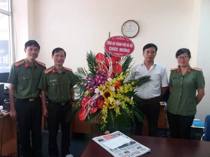 Đại diện Công an TP Hà Nội tặng hoa chúc mừng ngày báo Pháp Luật TP.HCM Ảnh: VIẾT LONG
