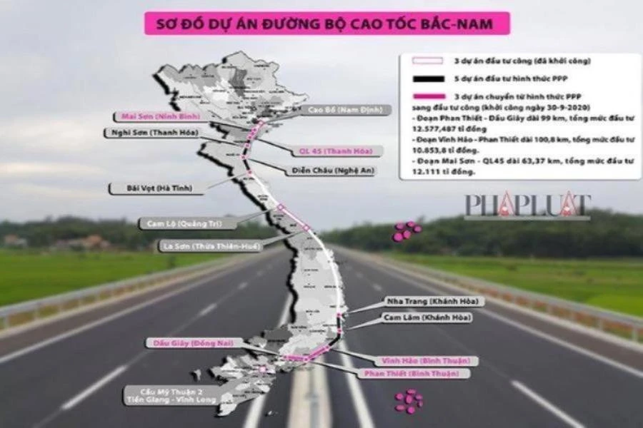 Dự án đường bộ cao tốc Bắc – Nam gồm 11 dự án thành phần. Trong đó, có 8 dự án đầu tư công (Cao Bồ - Mai Sơn, Mai Sơn – Quốc lộ 45, Cam Lộ - La Sơn, Vĩnh Hảo - Phan Thiết, Phan Thiết - Dầu Giây, cầu Mỹ Thuận 2, Quốc lộ 45 - Nghi Sơn và Nghi Sơn - Diễn Châu). Ba dự án thành phần triển khai theo phương thức đối tác công tư – PPP, loại hợp đồng BOT (Diễn Châu - Bãi Vọt, Nha Trang - Cam Lâm và Cam Lâm - Vĩnh Hảo).