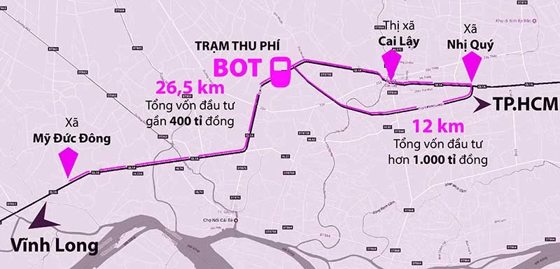 + Trước tiên phải khẳng định vị trí trạm thu phí được đặt trên QL1 để thu phí hoàn vốn cho dự án tuyến tránh dài 12 km qua thị xã Cai Lậy và cải tạo mặt đường QL1 dài 26 km. Do vậy, trạm thu phí nằm trên khu vực dự án chứ không phải nằm bên ngoài.