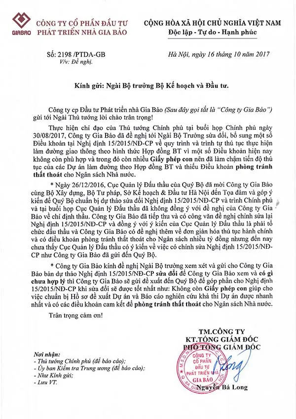 | Gửi cả Văn phòng Trung ương, Ủy ban Kiểm tra Trung ương Nguồn tin từ Bộ KH&ĐT cho hay bộ này đã từng trả lời nhiều lần kiến nghị của Công ty Gia Bảo cùng một số cá nhân chung địa chỉ với công ty này. Tuy vậy, nhiều văn bản chuyển phát đi lại bị trả về Bộ. Được biết ngoài việc kiến nghị sửa Nghị định 15/2015, Công ty Gia Bảo còn kiến nghị Thủ tướng cho phép thực hiện dự án đường sắt trên cao tuyến Yên Viên-Ngọc Hồi. Đối với TP.HCM, công ty này cũng đã 15 lần đề nghị cho phép nghiên cứu khả thi dự án “Phục hồi bán đảo Thanh Đa-Bình Quới hết ô nhiễm”. Trong các công văn của Công ty Gia Bảo, ngoài thành phần được gửi trực tiếp thì đều ghi gửi tới cả Văn phòng Trung ương Đảng, Ủy ban Kiểm tra Trung ương Đảng. |