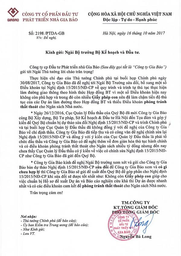 Còn trong văn bản gửi Bộ trưởng Nguyễn Chí Dũng, Công ty Gia Bảo cho rằng: Việc đề nghị bộ trưởng sửa đổi, bổ sung một số điều khoản tại Nghị định 15/2015 là do còn nhiều điều khoản không phù hợp. Cụ thể là còn nhiều giấy phép con làm chậm tiến độ các thủ tục và thiếu điều khoản phòng tránh thất thoát cho ngân sách nhà nước.