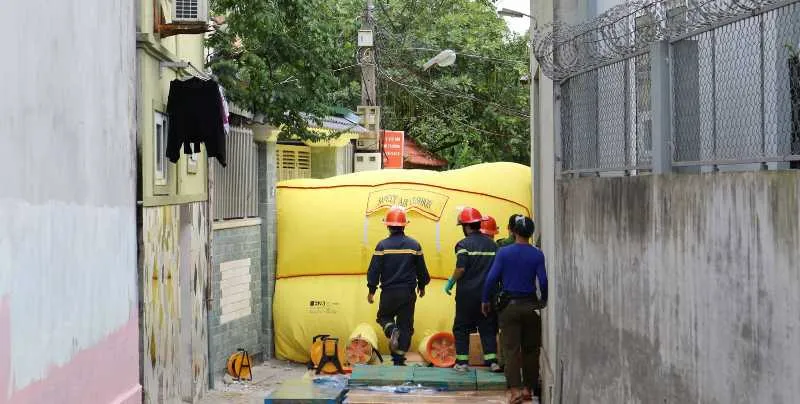 Lực lượng công an đã đưa phao, đệm hơi đến và mượn chăn, đệm người dân để dưới các ngôi nhà, các trục đường... đề phòng người này ném đứa trẻ xuống.
