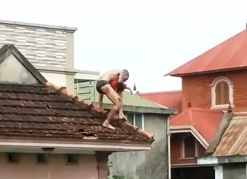 Người đàn ông ôm đứa trẻ nhảy từ mái nhà này sang mái nhà khác.