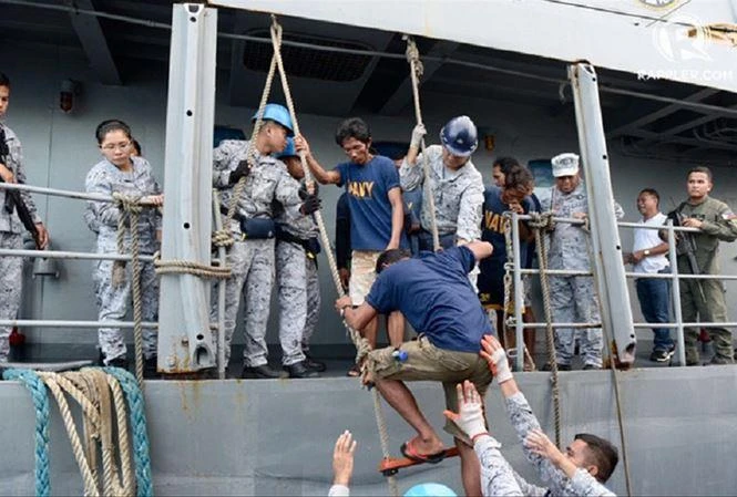 Ngư dân Philippines sau khi được ngư dân Việt Nam cứu nạn đã được đưa trở về sau sự cố. Ảnh: LeAnne Jazul/
