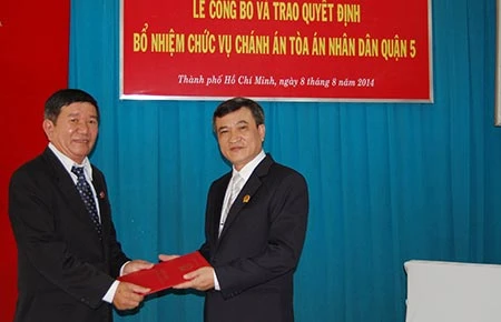 Phó chánh án TAND TP.HCM Nguyễn Văn Châu (trái) trao quyết định bổ nhiệm cho tân chánh án quận 5 Nguyễn Văn Chính. Ảnh: ÁI NHÂN