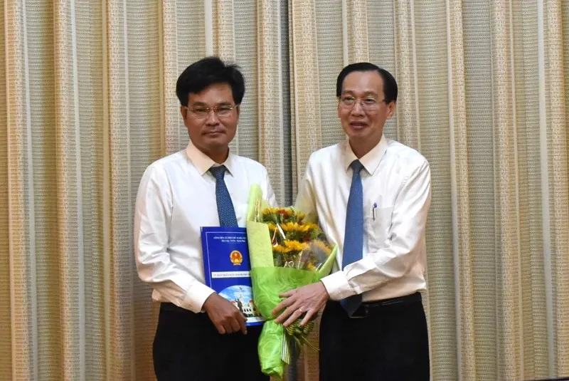Phó Chủ tịch thường trực UBND TP.HCM Lê Thanh Liêm trao quyết định bổ nhiệm cho ông Bùi Thanh Tân. Ảnh: PHƯƠNG THÙY