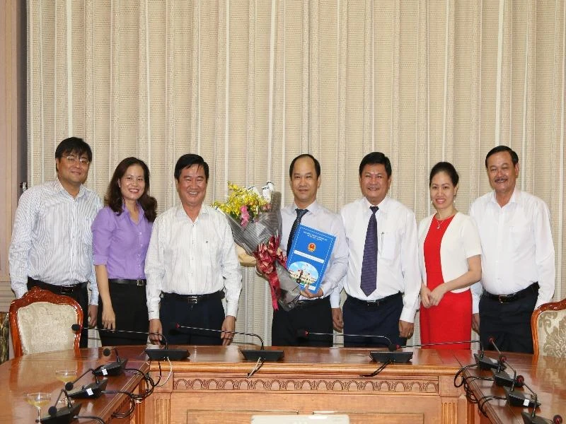 Ông Lê Đức Thanh (giữa, ôm hoa) giữ chức vụ phó giám đốc Sở Tư pháp TP.HCM. Ảnh: KP
