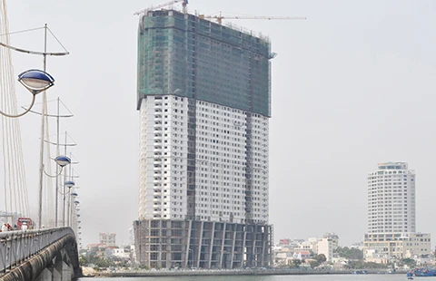 Dự án khu khách sạn - căn hộ cao cấp Mường Thanh Khánh Hòa đang xây dựng công bố chiều cao 48 tầng (trái với đồ án quy hoạch chung) đang bị buộc dừng lại ở tầng 39. Ảnh: TẤN LỘC