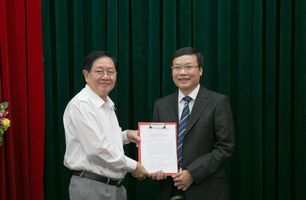 Ông Trương Hải Long (phải) nhận quyết định bổ nhiệm giữ chức Vụ trưởng Vụ Công chức Viên chức năm 2017. Ảnh: Moha
