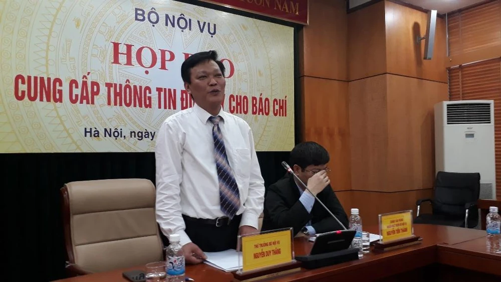 Thứ trưởng Bộ Nội vu Nguyễn Duy Thăng chủ trì họp báo tại Bộ Nội vụ chiều 26-3.