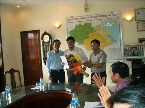 Ông Bảo (cầm hoa ở giữa) được bổ nhiệm chức vụ giám đốc Sở KH&ĐT tỉnh Quảng Nam ở tuổi 30. Ảnh: CTV