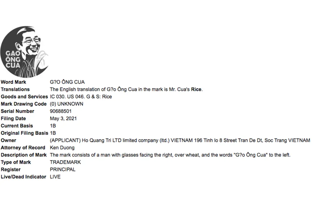 Nhãn hiệu “Gạo Ông Cua” đăng ký tại Văn phòng Sáng chế và thương hiệu Mỹ (USPTO).