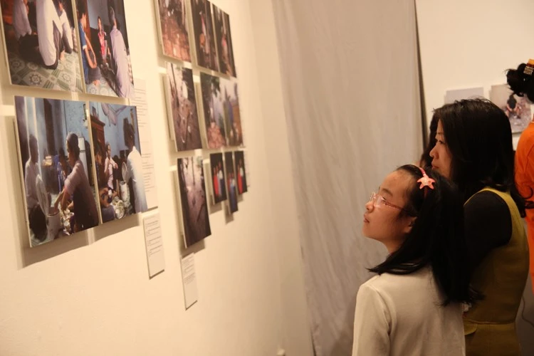 Khu vực triển lãm của Viện Goethe (Hà Nội) nơi đang diễn ra triển lãm "Bố ơi, con ước..." ngày 2-12 chật kín người tham dự.