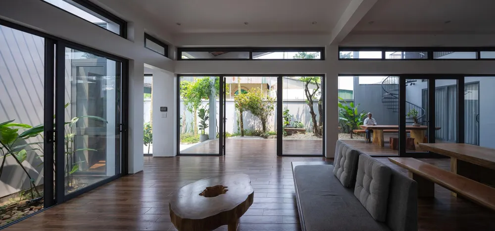 Phòng khách siêu thông thoáng, nhận ánh sáng từ giếng trời giữa nhà và khoảng hàng hiên dài.
