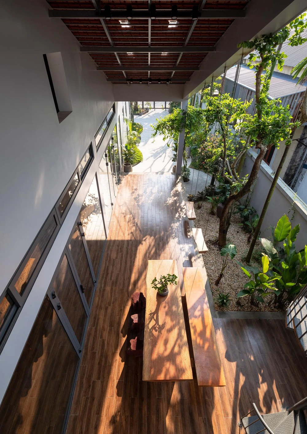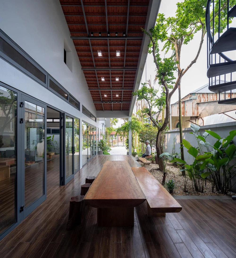 Kiến trúc sư thiết kế khoảng trống rộng rãi có bộ bàn gỗ dài kết hợp với cây xanh dọc hành lang tạo nên sân chơi lý tưởng cho gia đình.