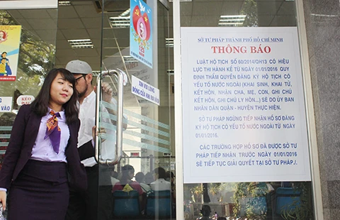 Những ngày gần đây, tại cổng Sở Tư pháp TP.HCM và cửa phòng tiếp nhận hồ sơ dán thông báo về việc thay đổi thẩm quyền đăng ký hộ tịch có yếu tố nước ngoài. Theo đó, từ hôm nay (1-1-2016), việc đăng ký kết hôn, khai sinh, khai tử, nhận cha mẹ cho con, ghi chú kết hôn, ghi chú ly hôn… có yếu tố nước ngoài sẽ do UBND quận/huyện thực hiện thay vì Sở Tư pháp như lâu nay.