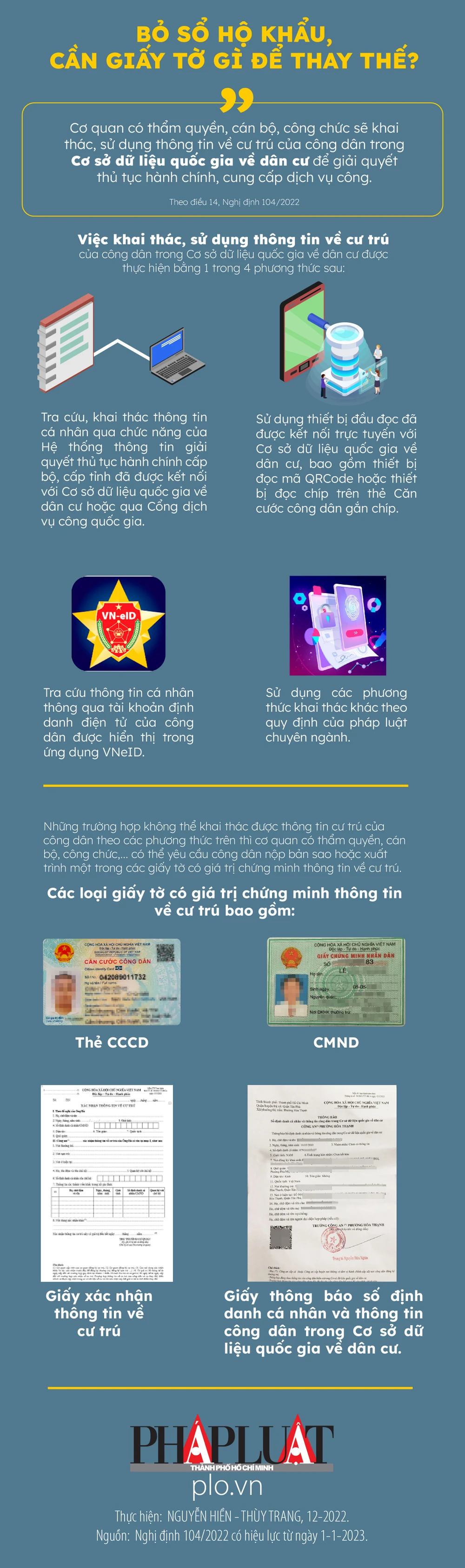 (PLO)-  Từ 1-1-2023, người dân có thể sử dụng một trong các loại giấy tờ như thẻ CCCD, Giấy xác nhận thông tin về cư trú, Giấy thông báo số định danh cá nhân để thay thế sổ hộ khẩu theo Nghị định 104/2022.