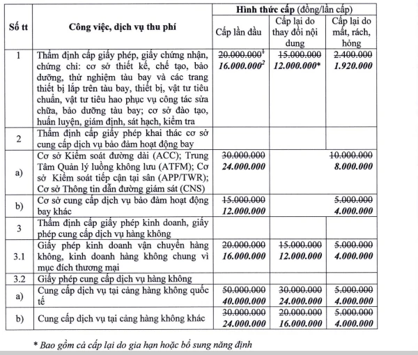 Cụ thể, phí thẩm định cấp giấy phép, giấy chứng nhận chứng chỉ; cơ sở thiết kế, chế tạo, bảo dưỡng, thử nghiệm máy bay và các trang thiết bị trên máy bay... cấp lần đầu từ 20 triệu đồng xuống 16 triệu đồng/lần cấp.