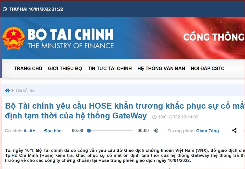 Văn bản của Bộ Tài chính phát đi chỉ đạo của Bộ trưởng Hồ Đức Phớc yêu cầu VNX và Hose kiểm tra, khắc phục sự cố mất ổn định tạm thời của hệ thống trả thông tin thị trường về cho các công ty chứng khoán (hệ thống Gateway), xảy ra tại Hose trong phiên giao dịch ngày 10-1.
