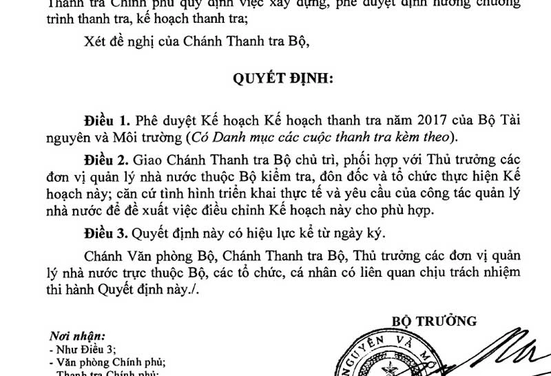 Quyết định phê duyệt kế hoạch thanh tra năm 2017 của Bộ TN&MT.