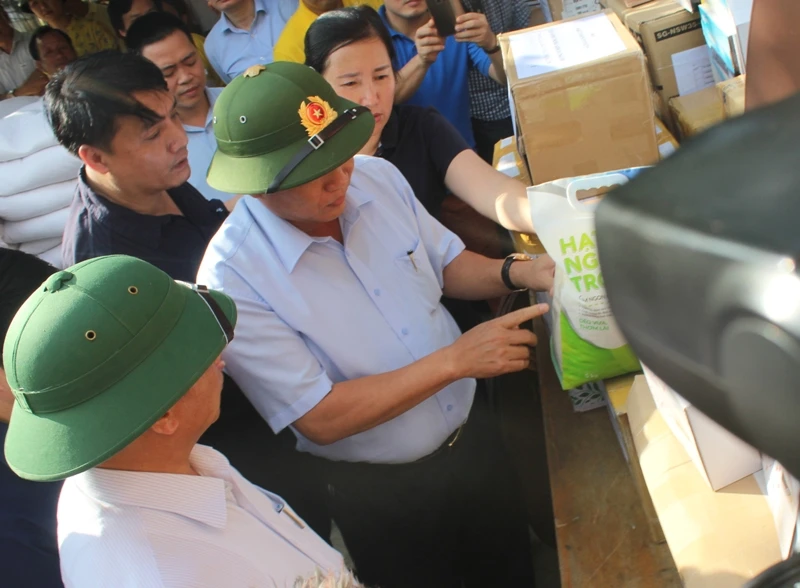 Bộ trưởng Trương Minh Tuấn kiểm tra lại loại gạo và thời hạn sử dụng.