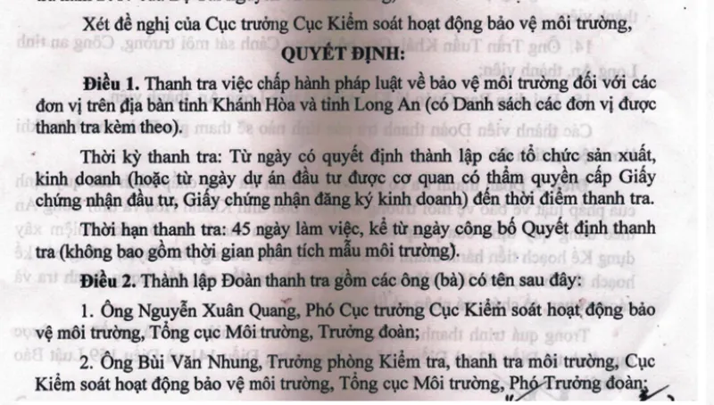 | Ông Nguyễn Xuân Quang là cục phó Cục Kiểm soát hoạt động bảo vệ môi trường của Tổng cục Môi trường, Bộ TN&MT. Theo quyết định của tổng cục trưởng Tổng cục Môi trường, doàn thanh tra 15 người do ông Nguyễn Xuân Quang, Phó Cục trưởng Cục Kiểm soát bảo vệ môi trường, làm trưởng đoàn. Trong đó người của Tổng cục Môi trường là năm người, còn lại là đại diện của Khánh Hòa và Long An. Theo kế hoạch, đoàn thanh tra sẽ làm việc với 30 đơn vị ở địa bàn Long An. Các thành viên có nhiệm vụ thanh tra việc chấp hành các quy định của pháp luật về bảo vệ môi trường đối với các đơn vị trên địa bàn tỉnh Khánh Hòa và Long An kể từ khi các tổ chức sản xuất, kinh doanh điến thời điểm thanh tra. Thời hạn thanh tra là 45 ngày. TR.THANH |