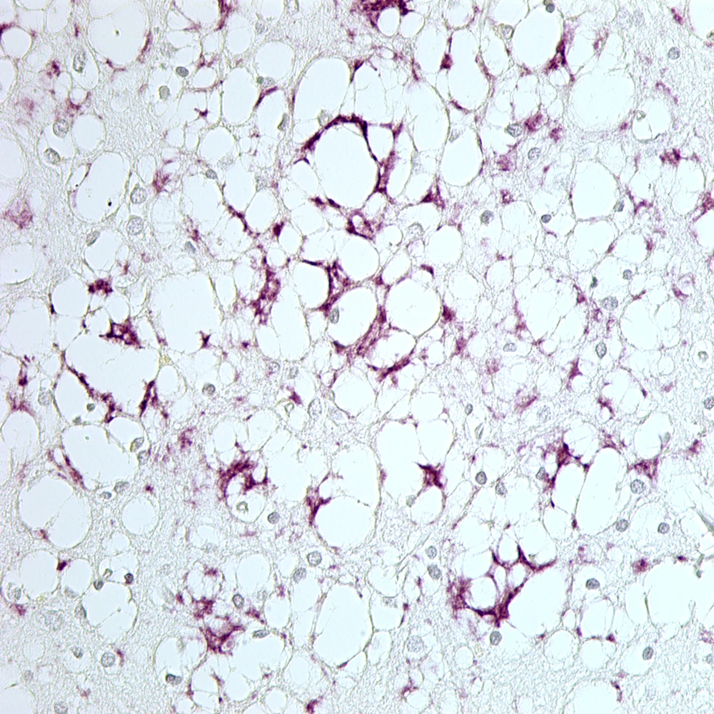 Não bệnh nhân mắc bệnh CJD bị thoái hóa thần kinh và hình thành các mô lớn prion màu tím. (Nguồn: scientificamerican.com)