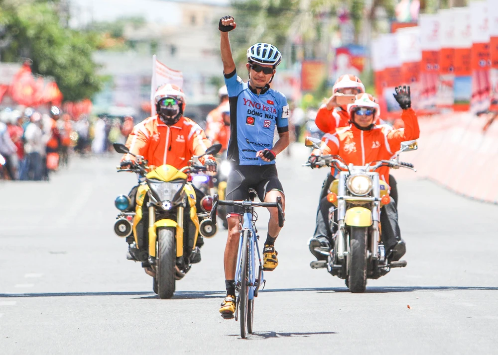 Với những guồng chân mạnh mẽ cùng nền tảng thể lực dồi dào, cựu tay đua Vĩnh Long băng băng lao nhanh về đích trước sự bất lực rượt đuổi của 10 đối thủ phía sau.
