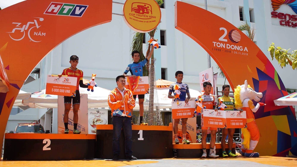 Nguyễn Hoàng Sang trên bục nhận thưởng nhất chặng 26.