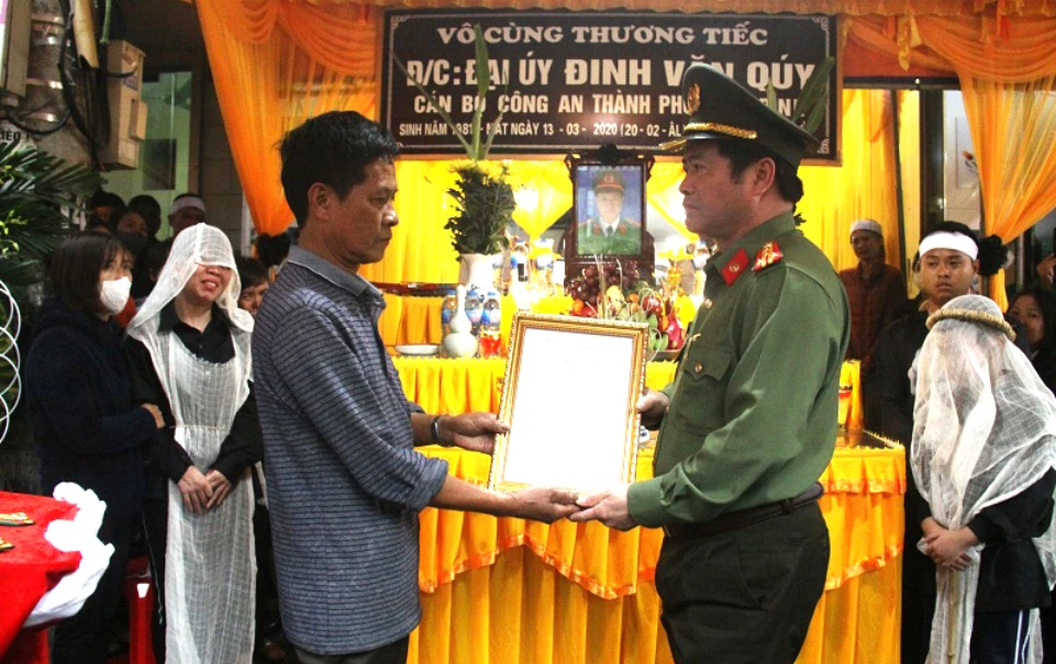 Chiều nay (14-3), thông tin từ Công an tỉnh Ninh Bình cho biết được sự ủy quyền của Bộ trưởng Bộ Công an, Đại tá Phạm Văn Sơn, Giám đốc Công an tỉnh Ninh Bình đã trao quyết định thăng cấp bậc hàm từ đại úy lên thiếu tá công an nhân dân cho đại diện gia đình Thiếu tá Đinh Văn Quý.