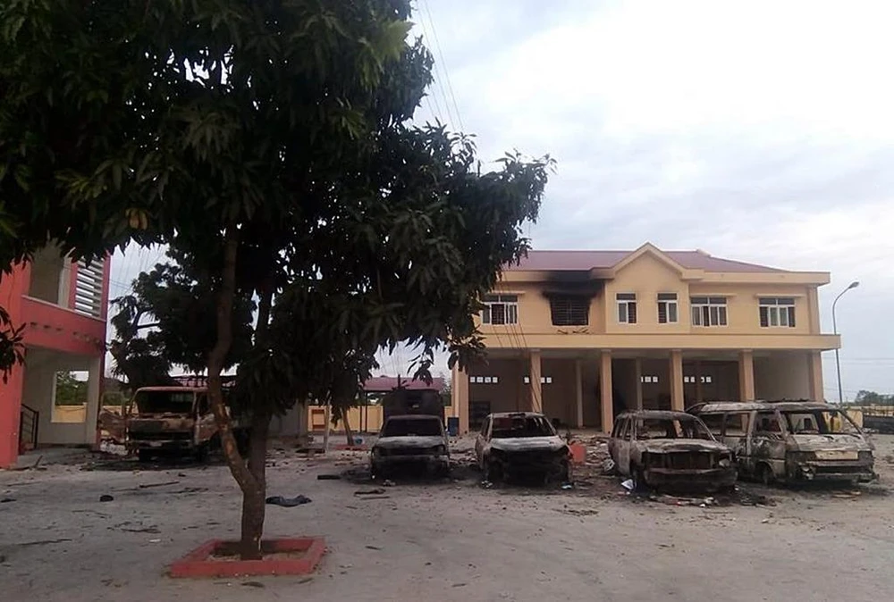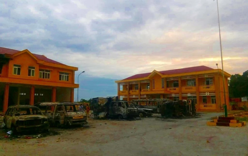 Hiện trường vụ đập phá, đốt cháy trụ sở và xe cảnh sát tại Phan Rí Cửa