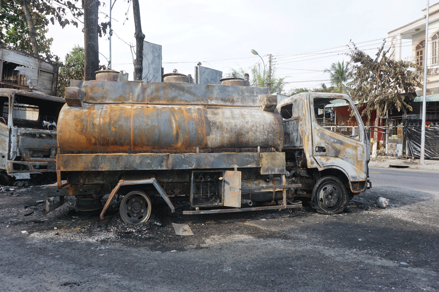 Chiếc xe bồn bị cháy rụi. Ảnh: N.C