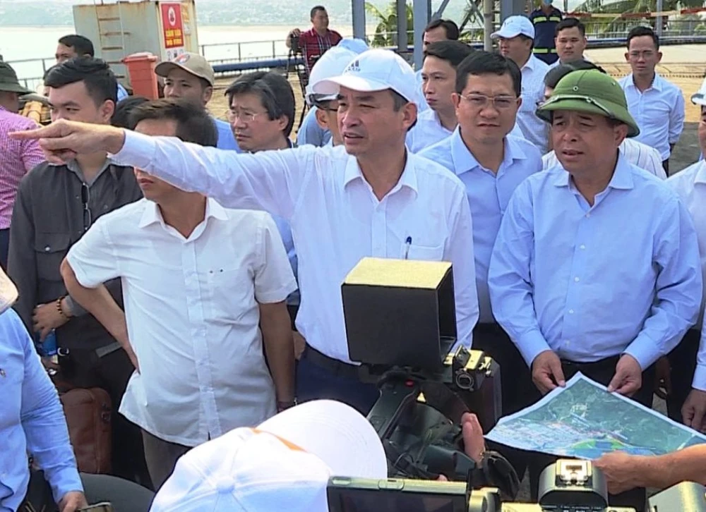 Ông Nguyễn Chí Dũng, Bộ trưởng Bộ Kế hoạch và Đầu tư cùng ông Lê Trung Chinh, Chủ tịch UBND TP Đà Nẵng, khảo sát khu vực xây dựng cảng Liên Chiểu Ảnh: HẢI HIẾU