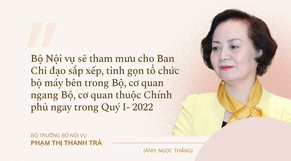 Bộ Nội vụ sẽ tham mưu cho Chính phủ hoàn thành sắp xếp, tinh gọn tổ chức bộ máy bên trong Bộ, cơ quan ngang bộ, cơ quan thuộc Chính phủ gắn với quy định về chức năng, nhiệm vụ, quyền hạn, tổ chức bộ máy của các đơn vị ngay trong quý I-2022. Trao đổi với Pháp Luật TP.HCM đầu xuân Nhâm Dần, Bộ trưởng Nội vụ Phạm Thị Thanh Trà cho hay.