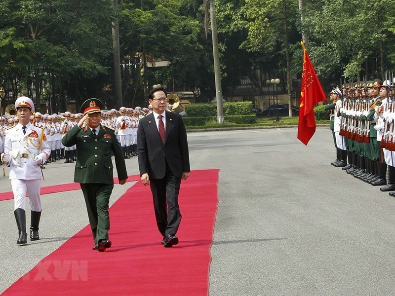 Bộ trưởng Bộ Quốc phòng Ngô Xuân Lịch và Bộ trưởng Bộ Quốc phòng Hàn Quốc Song Young-moo duyệt đội danh dự tại lễ đón. Ảnh: TTXVN