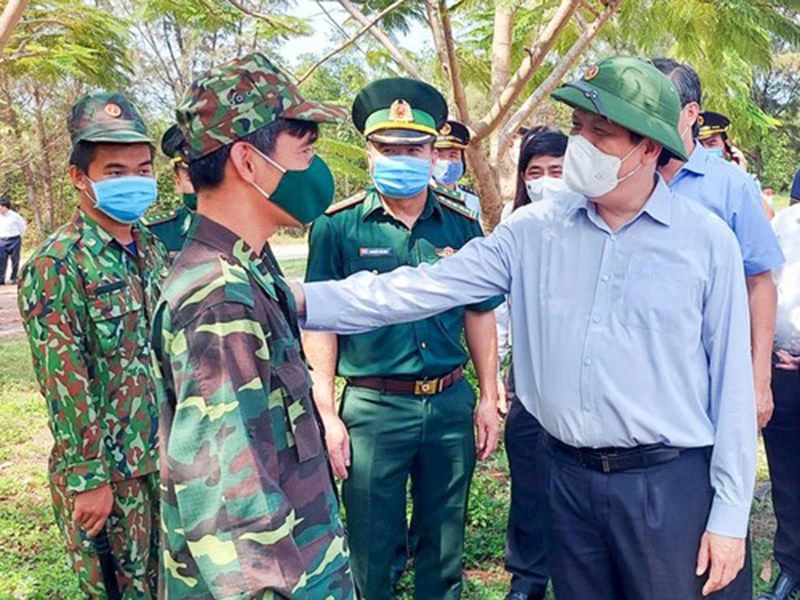 Bộ trưởng Bộ Y tế Nguyễn Thanh Long (bìa phải) thăm hỏi, động viên lực lượng làm nhiệm vụ tại cửa khẩu quốc tế Hà Tiên. Ảnh: NH