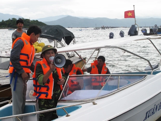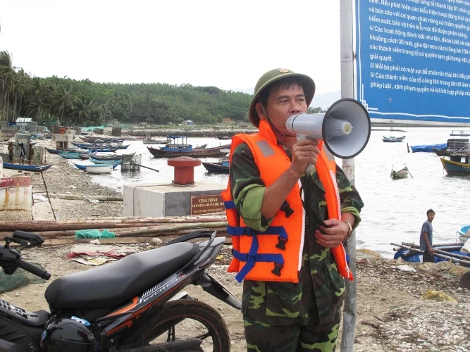 Trung tá Võ Tấn Bằng, Phó chỉ huy trưởng Ban Chỉ huy Quân sự thị xã Sông Cầu (Phú Yên) trực tiếp đi thông báo, triển khai việc ứng phó bão cho bà con ngư dân xã Xuân Phương, thị xã Sông Cầu