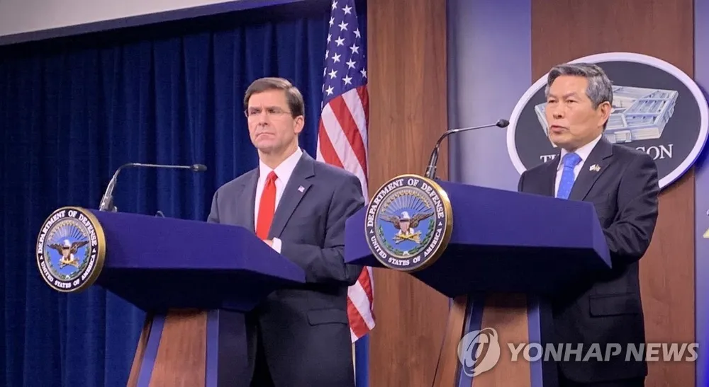Bộ trưởng Quốc phòng Mỹ Mark Esper và Bộ trưởng Quốc phòng Hàn Quốc hồi tháng 2. Ảnh: YONHAP