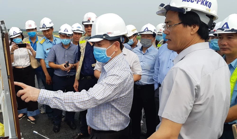 Bộ trưởng Nguyễn Văn Thể kiểm tra thực tế công trường xây dựng, nâng cấp đường băng sân bay Nội Bài. Ảnh: V.LONG