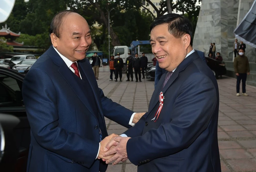 Thủ tướng Nguyễn Xuân Phúc và Bộ trưởng Nguyễn Chí Dũng trước khi vào dự lễ kỷ niệm 75 năm ngành KH&ĐT sáng 31-12. Ảnh: VGP