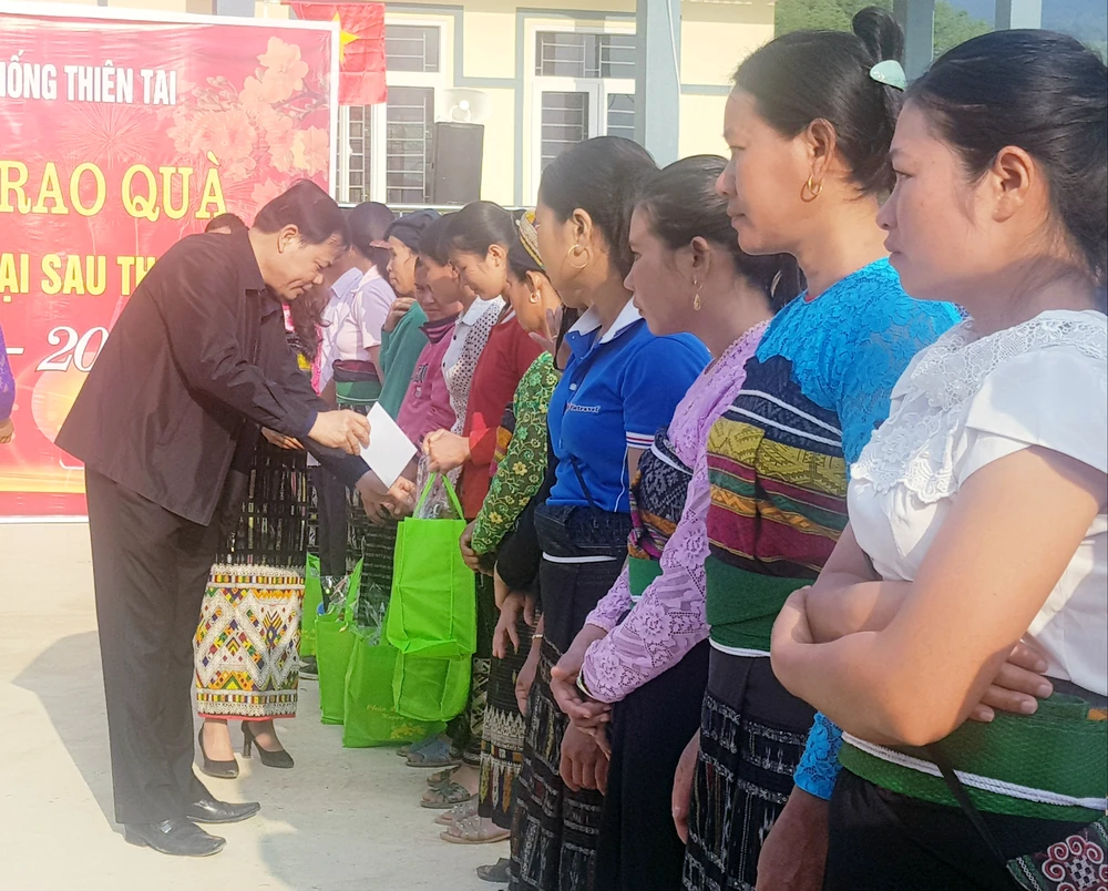 Bộ trưởng Nguyễn Xuân Cường tặng quà cho người dân bị thiệt hại do thiên tai tại bản Sa Ná. Ảnh: AH