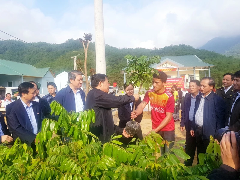 Bộ trưởng Nguyễn Xuân Cường tặng cây giống cho người dân bị thiệt hại do thiên tai ở Sa Ná. Ảnh: AH