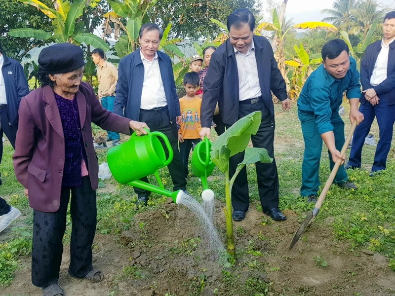 Sau khi hỏi thăm sức khỏe, Bộ trưởng Nguyễn Xuân Cường đã tặng hộ gia đình cụ Đỗ Thị Mơ một số cây chuối giống tiêu hồng, xoài và giống gà ri chân vàng để gia đình phát triển kinh tế.