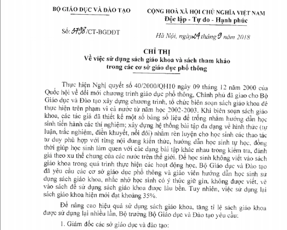 Liên quan đến vấn đề sách giáo khoa (SGK) dùng một lần gây lãng phí, được dư luận quan tâm những ngày qua, chiều 24-9, Bộ trưởng GD&ĐT Phùng Xuân Nhạ đã ký ban hành Chỉ thị số 3798 về việc sử dụng SGK, sách tham khảo trong các cơ sở giáo dục phổ thông.