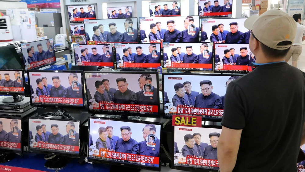 Tin tức Triều Tiên thử hạt nhân lần thứ sáu được phát sóng tại một tiệm đồ điện tử ở Seoul, Hàn Quốc ngày 3-9. Ảnh: SPUTNIK